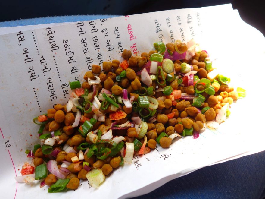Chana chaat podávaný v papíru ve vlaku v Indii