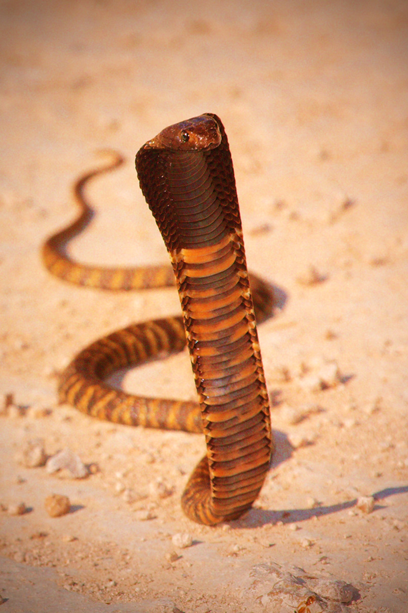Kobra číhající na kořist mezi projíždějícími auty, foto: Šimon Athaj Řeřucha, Namibie