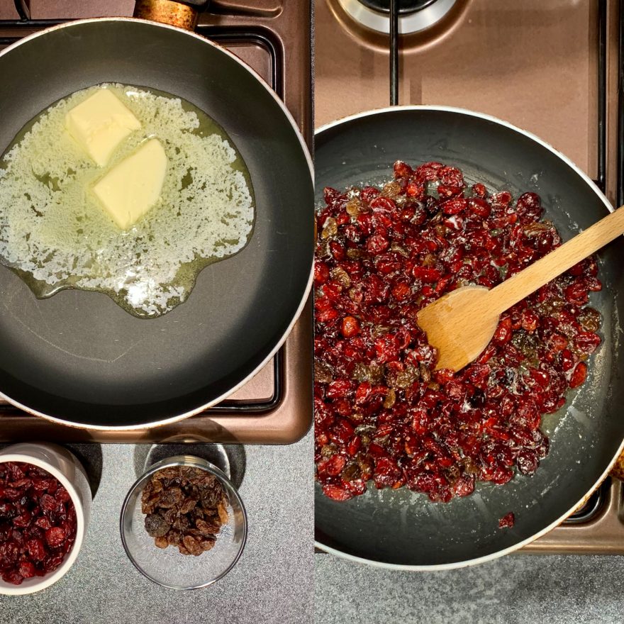 Polovinu rýže dáme do zapékací mísy a přidáme brusinky s rozinkami.