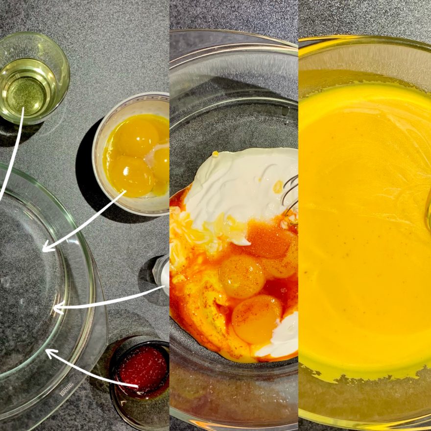 V misce smícháme jogurt, slunečnicový olej, žloutky, sůl a rozdrcený šafrán, který jsme zalili dvěma čajovými lžičkami vroucí vody.