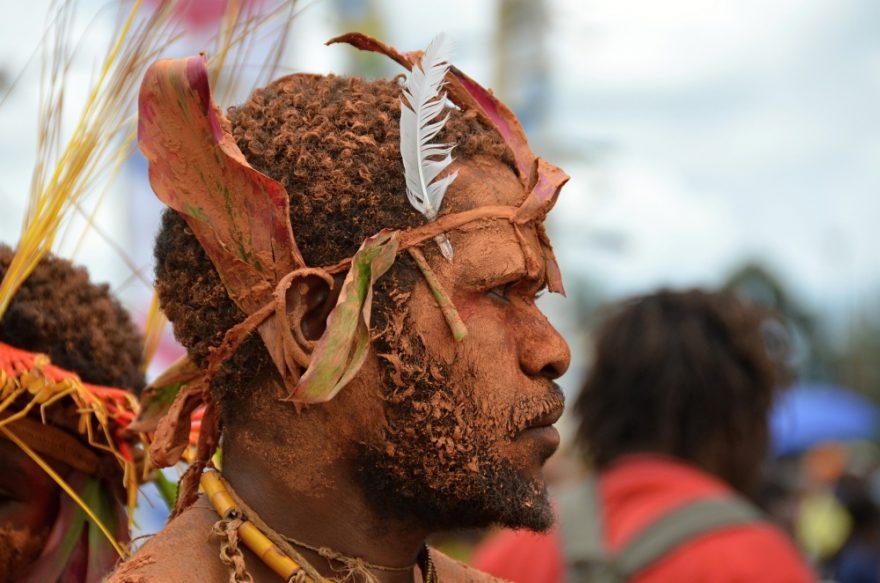 Kulturní skupina Wara Sinowai z provincie Simbu s hojně zdobenými čelenkami vyrobenými z per exotických ptáků.