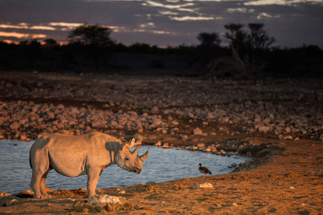 Nosorožec černý u napajedla při západu slunce v národním parku Etosha. Autor: Václav Šilha