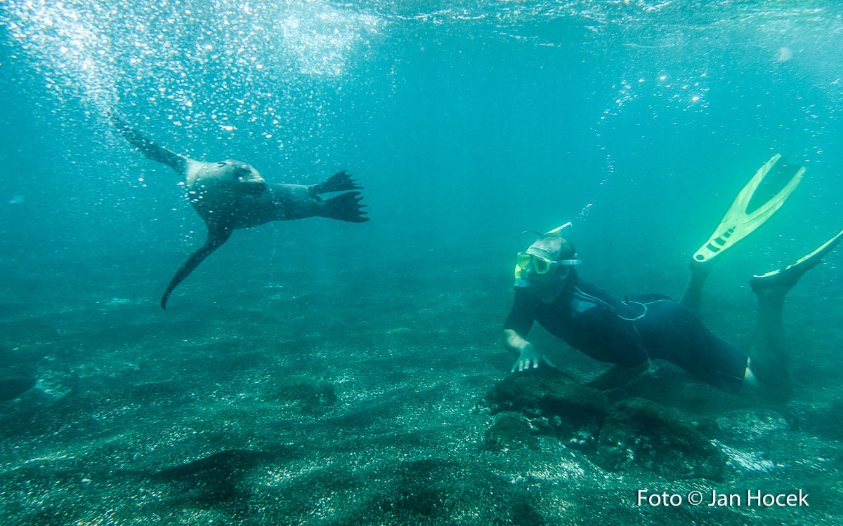 Nejvíc mě ale dostalo koupání se zvědavými lachtany, kteří kolem nás při šnorchlování proplouvají v těsné blízkosti a svádějí k hrátkám pod vodou, Galapágy