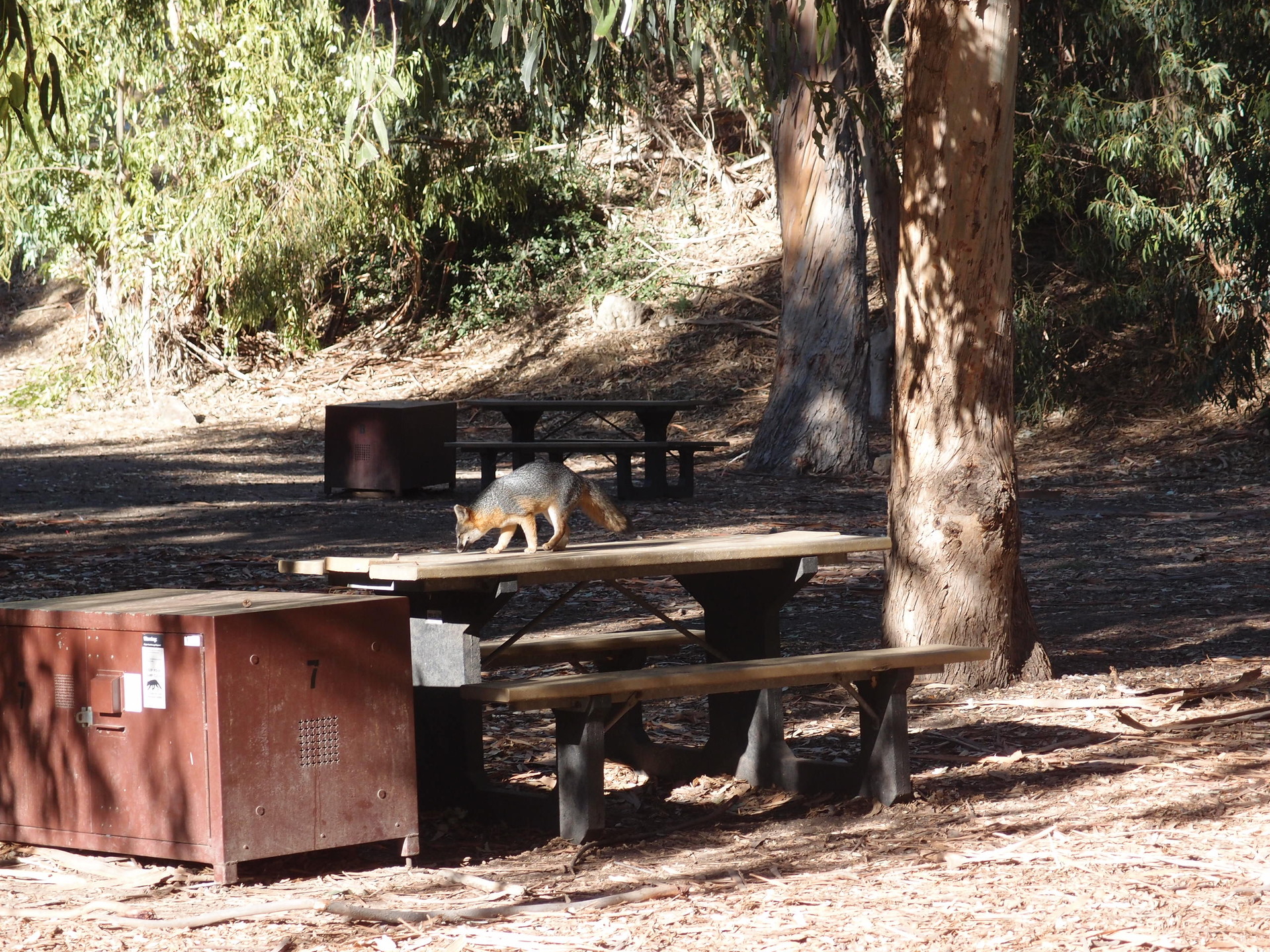 Liška bezostyšně se pídící po zbytcích jídla v kempu, Channel Islands, USA