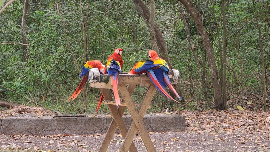 Papoušci Guacamayas v Copánu jsou fakt všude