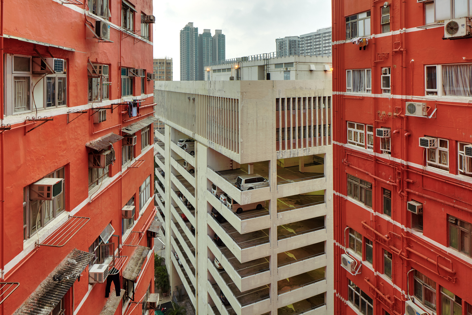 Výhled z pavlače domu Hung Fai ve čvrti Yau Ma Tei. Barevné věžáky jsou v Hongkongu velmi častým jevem. Hongkong