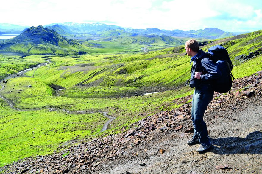 Stoupání směrem do Duhových hor lemují četné fumaroly neboli výpustě síry. Země pod nohama doslova vře. Vlevo je vidět zbytky lávového pole. Island