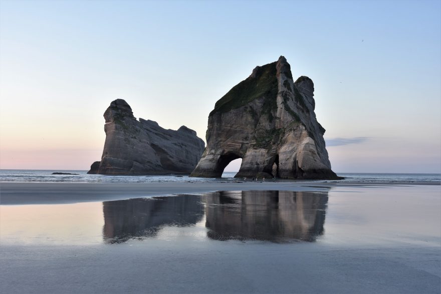 Wharariki beach, známá z filmu Hobit, je přistupná, jak jinak, než zdarma. Nový Zéland