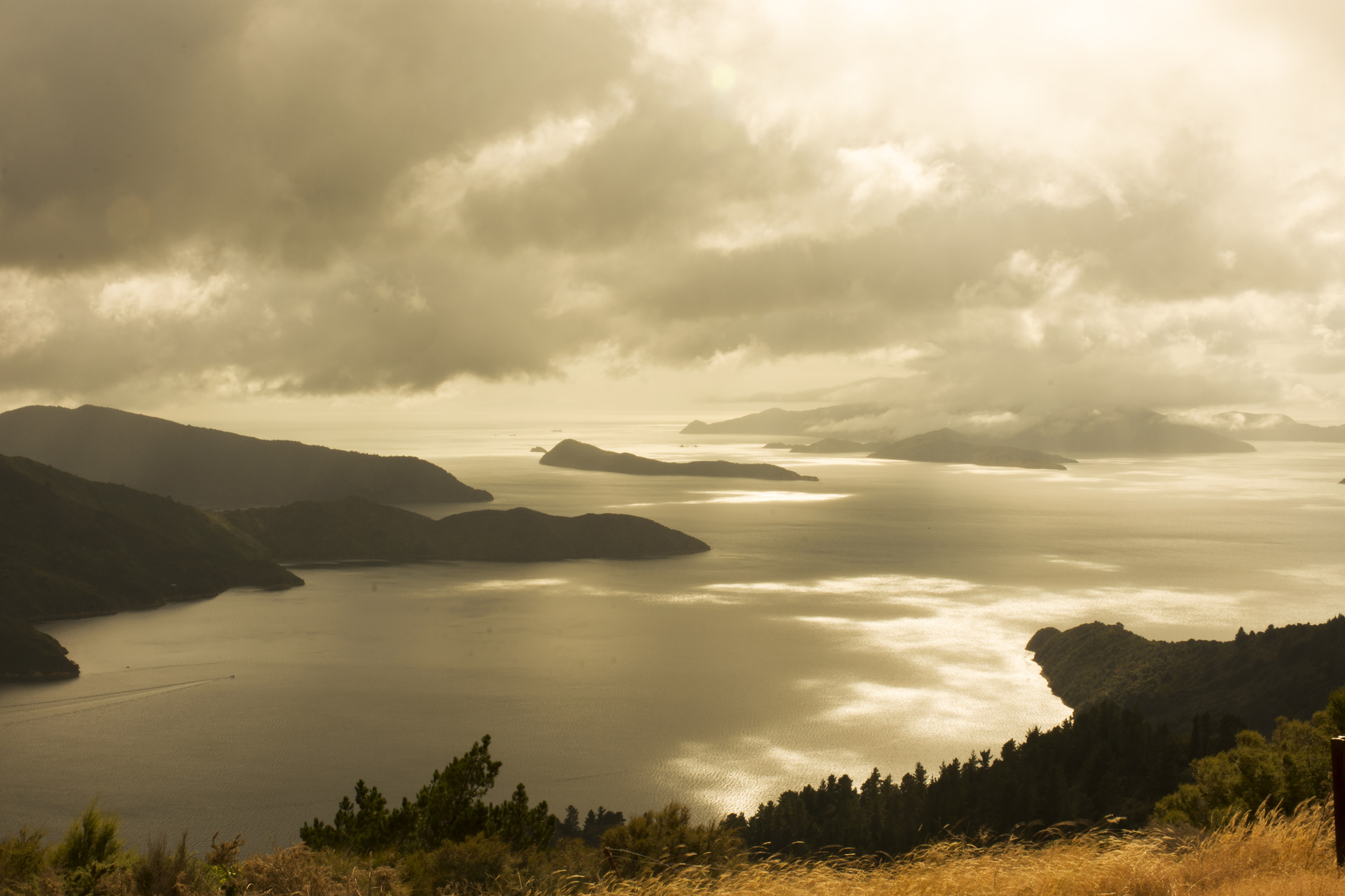 Výhled na Marlborough sounds si vychutnáte při cestě trajektem mezi ostrovy (pokud tedy poplujete ve dne). Nový Zéland