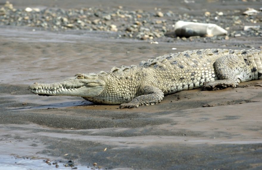 Sající babočka Dryas julia na hlavě netečného krokodýla.