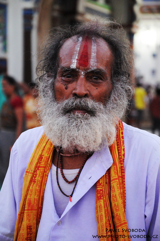 Svatý muž sedící před chrámem Janaki Mandir, Nepál
