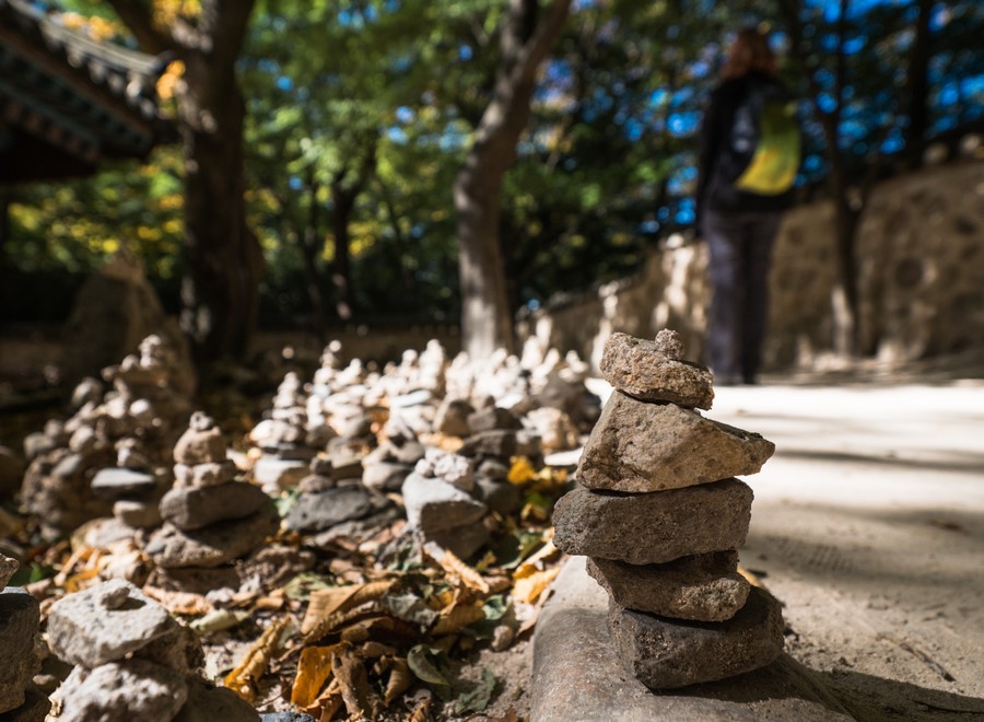 Malé mohylky z kamínků Korejci s oblibou staví u lesních chrámů, Odaesan, Jižní Korea