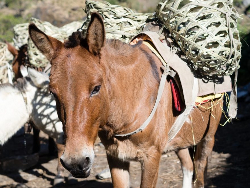 Při horském pochodu mají ochránci voleb pušku jen tak ležérně přehozenou přes rameno, Manaslu circuit, Nepál