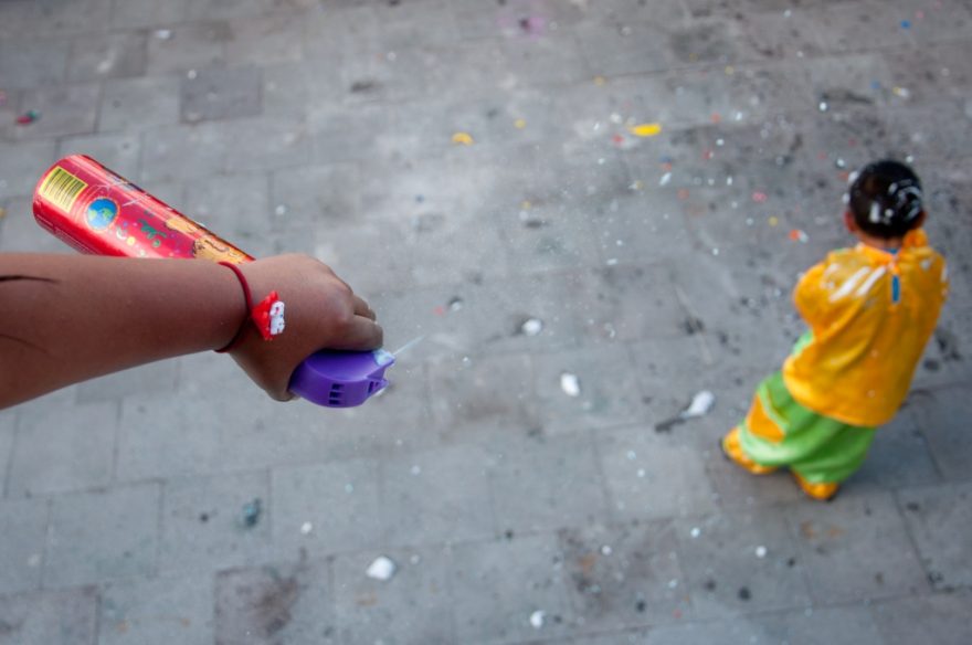 Jednou z hlavních aktivit latinskoamerických karnevalů je stříkání pěny ve spreji, Ekvádor