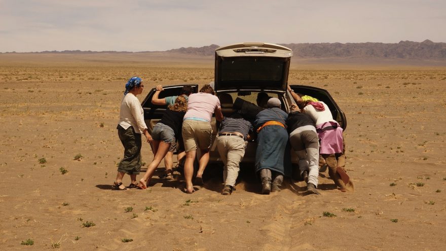 Deset turistů a velbloudář nám pomáhají ze svízelné situace