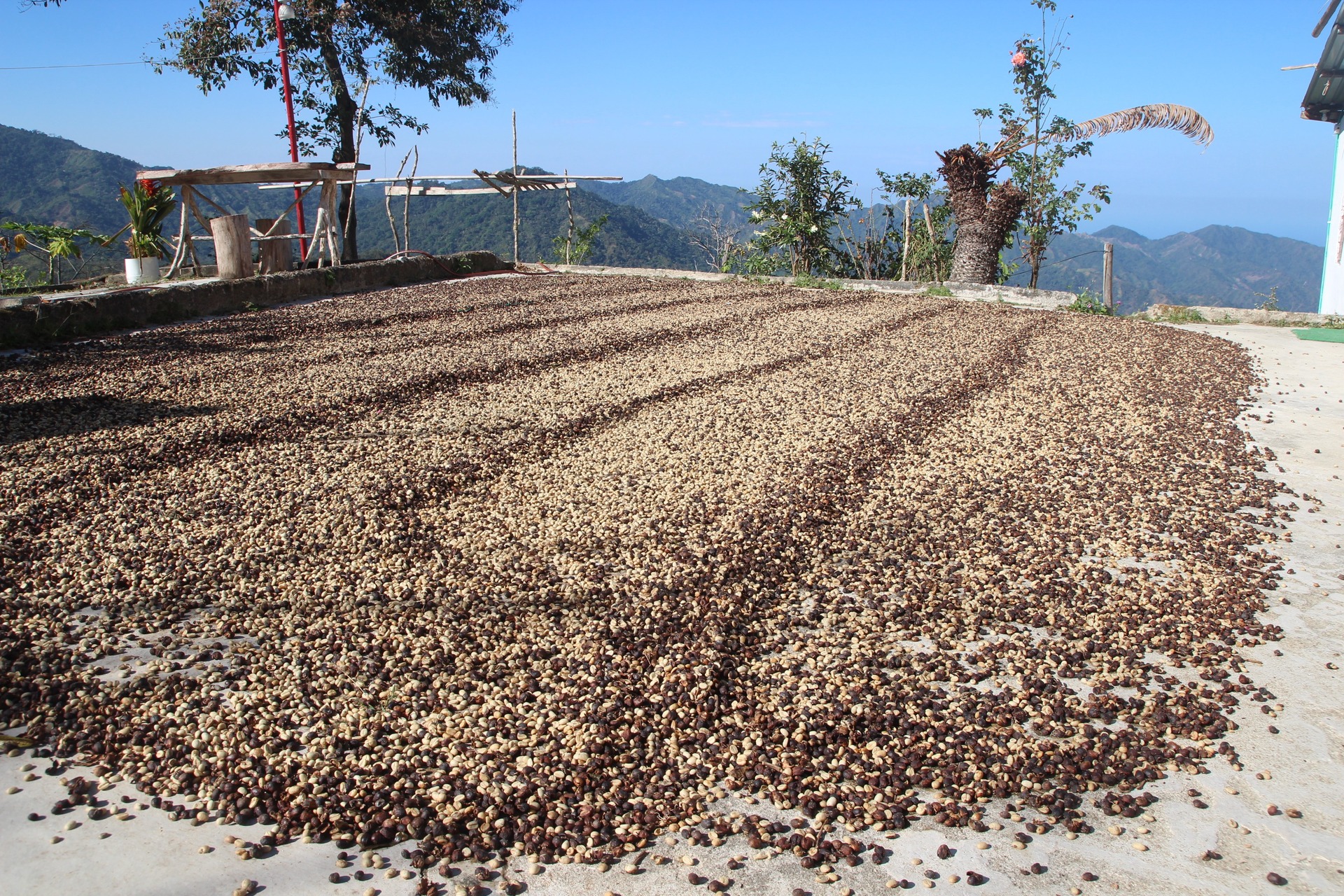 Sušící se káva na farmě La Candelaria, Minca, Kolumbie