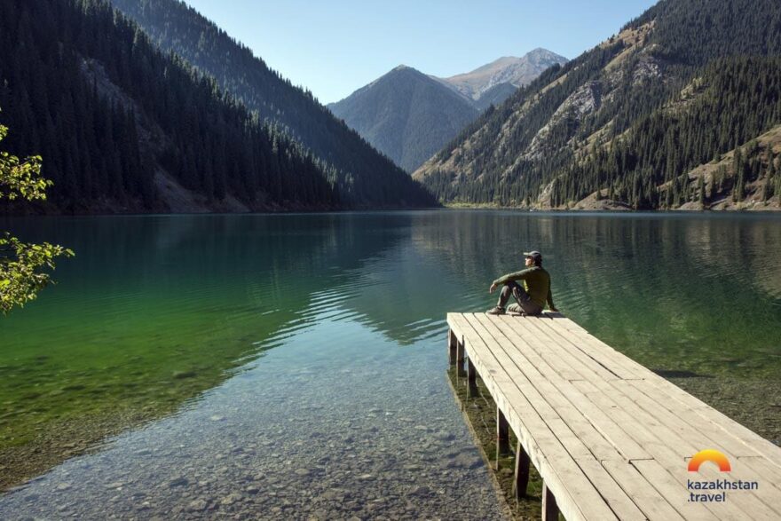 Jezero Kaindi - z vody trčí mrtvé kmeny stromů