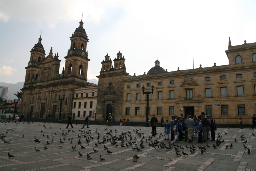 Hlavní náměstí Bogoty je spíše než turisty přeplněno holuby, což bohužel ještě umocňují prodavačky zrní.