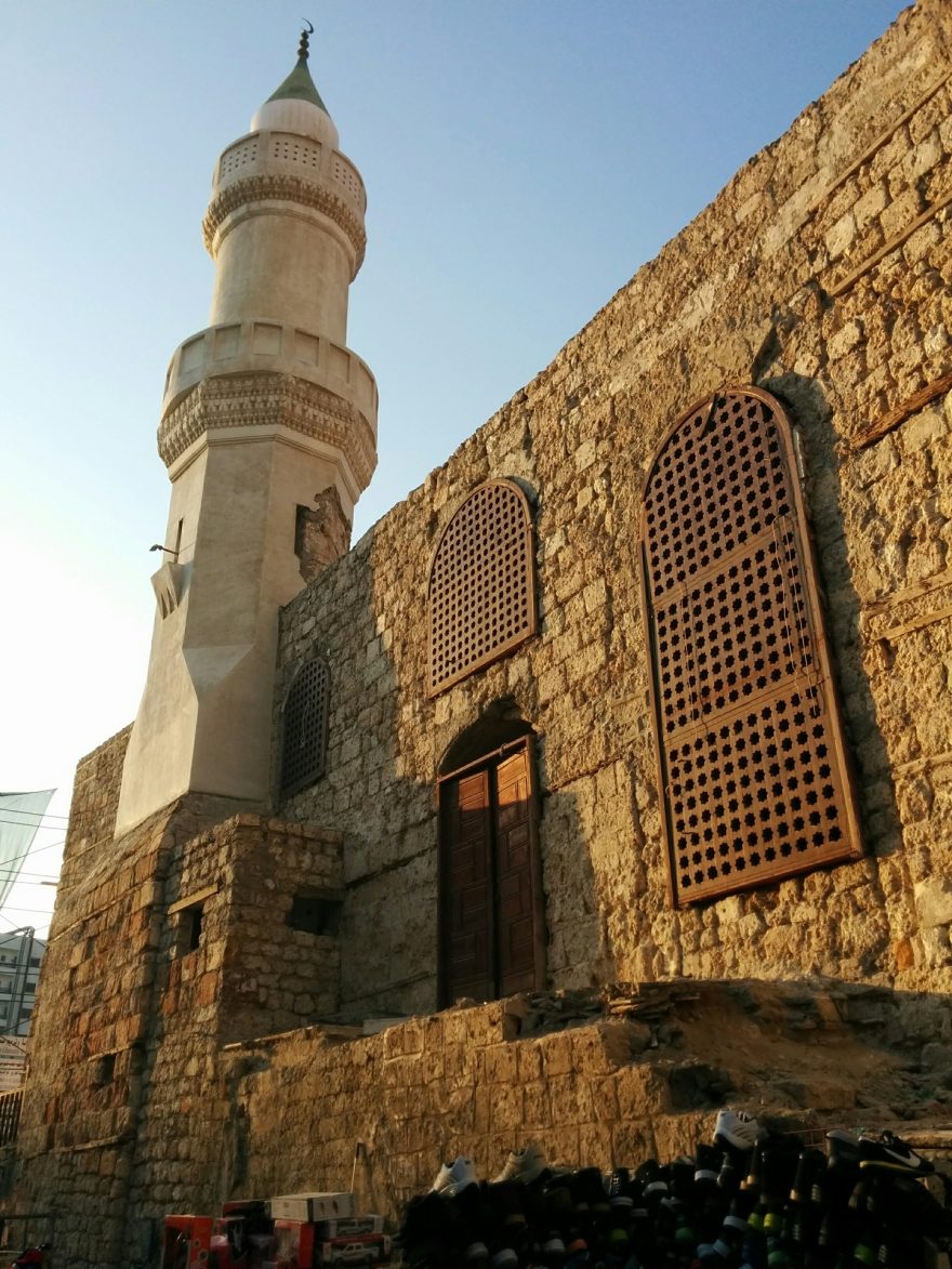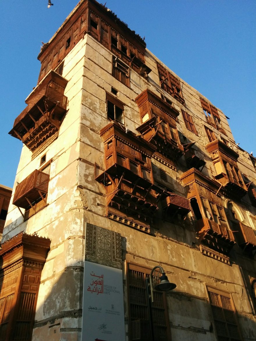 Moderní architektura často využívá tradičních prvků, tento dům stojí symbolicky na hranici staré a nové části Džiddy, Džidda, Saudská Arábie