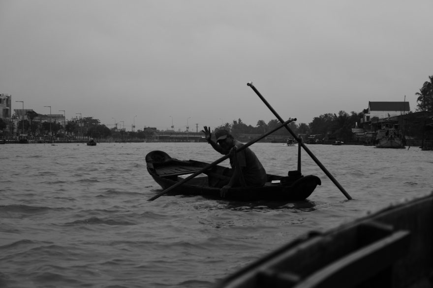 Jedna z žen prodávající ananasy na své lodi, plovoucí trhy, Can Tho, Vietnam