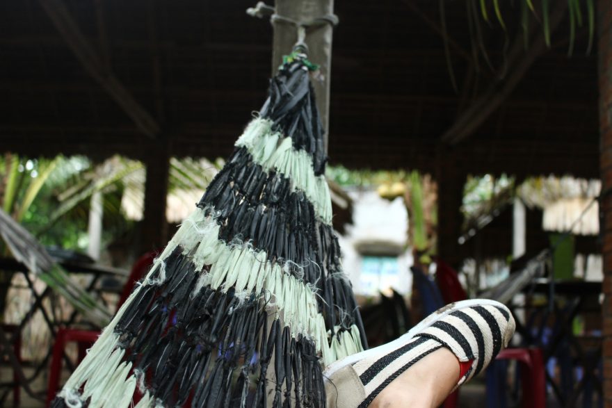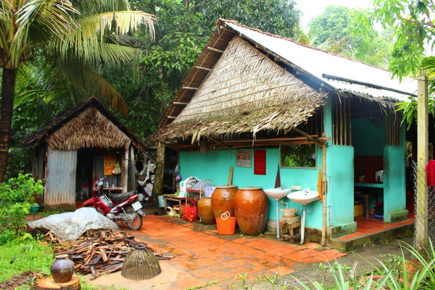 Pohled na zadní část jednoho z cihlových domů, Can Tho, Vietnam