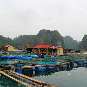 Plovoucí rybí farmy, zátoka Lan Ha Bay, Vietnam