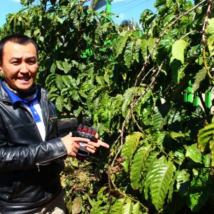 Průvodce podávající výklad o druzích kávy, Da Lat, Vietnam