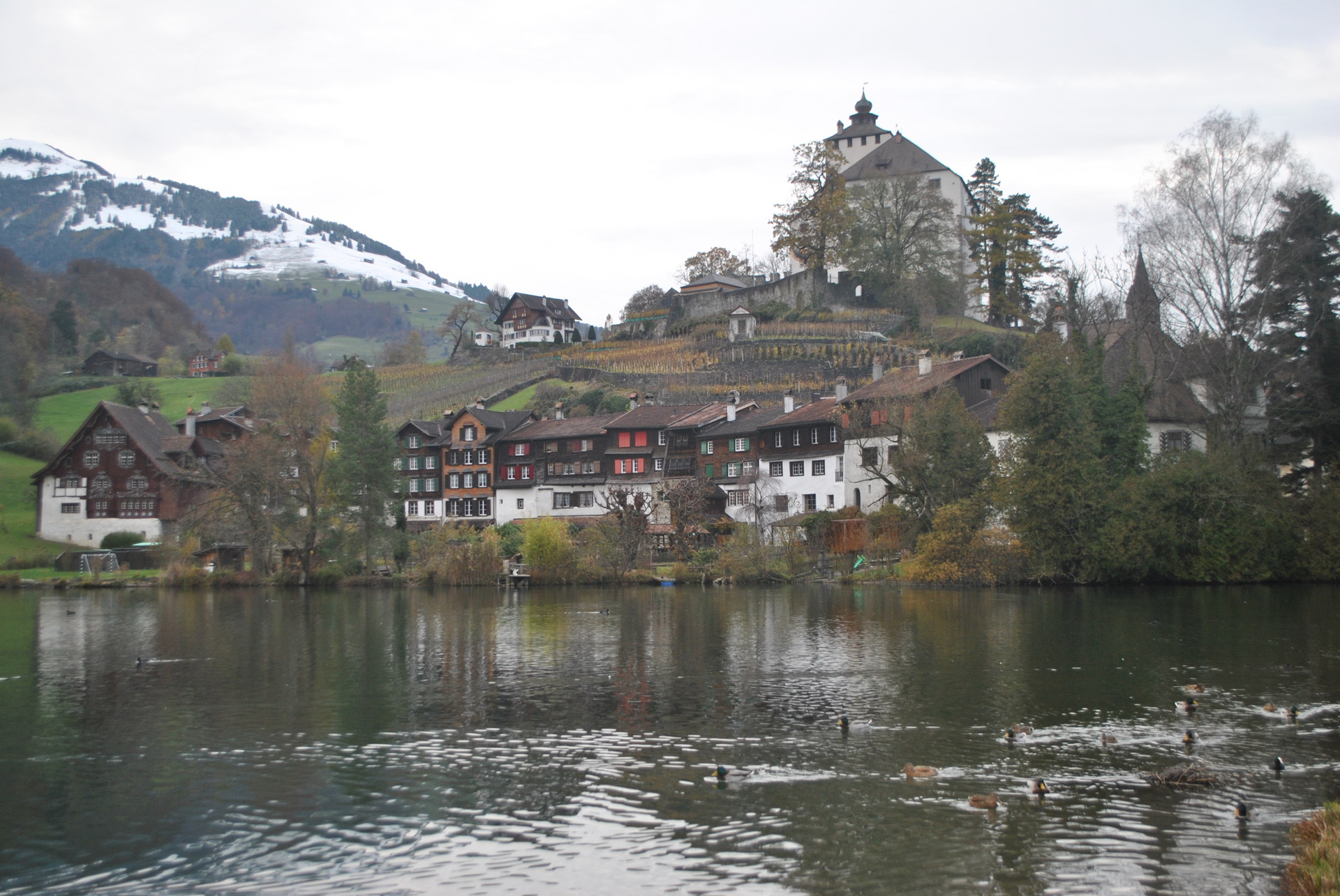 Pohled z Buchs na skanzen se zámkem, Lichtenštejnsko