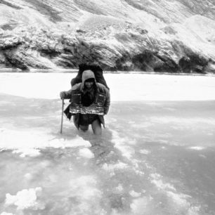 Brodění do pasu břečkou ledové vody a tajícího ledu