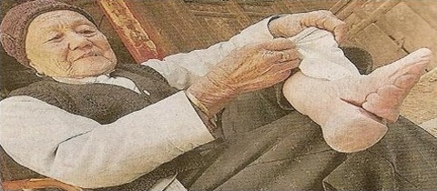 Čínské ženy ukazují rozdíl mezi normálníma a deformovanýma nohama