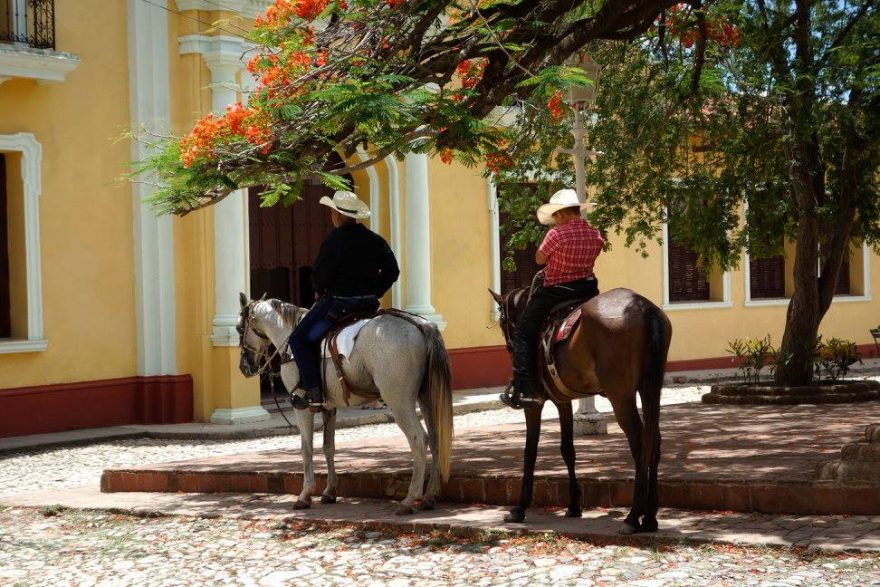 Barevné domky a stará auta, typické kubánské městečko, Kuba