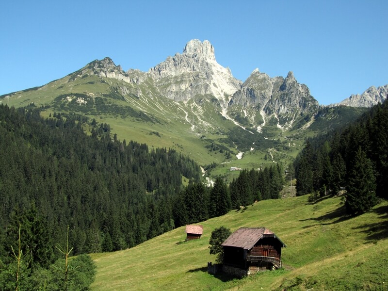 Stezka vede mezi alpskými vrcholy, Rakousko
