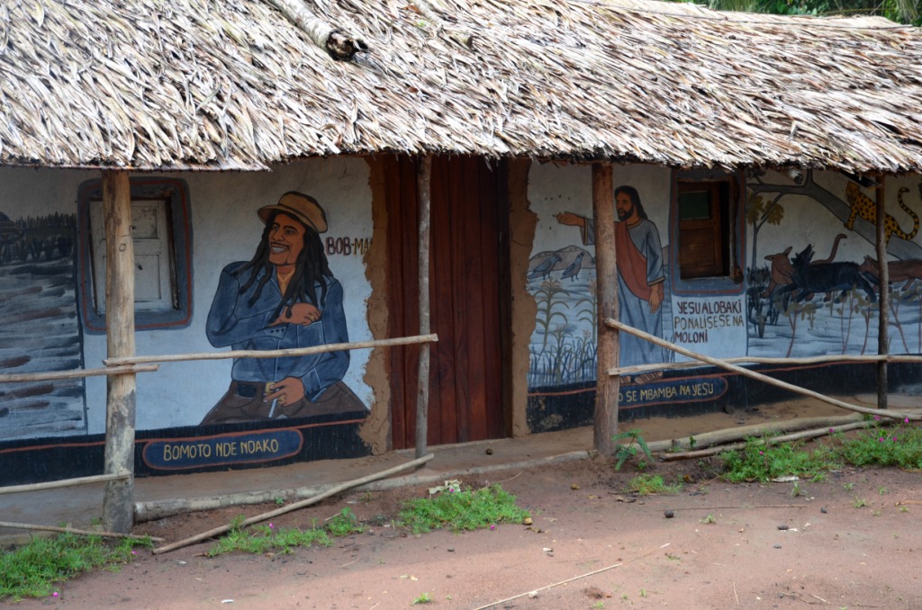 Typická koláž v Kongu – kombinace války, Boba Marleyho a Ježíše Krista.