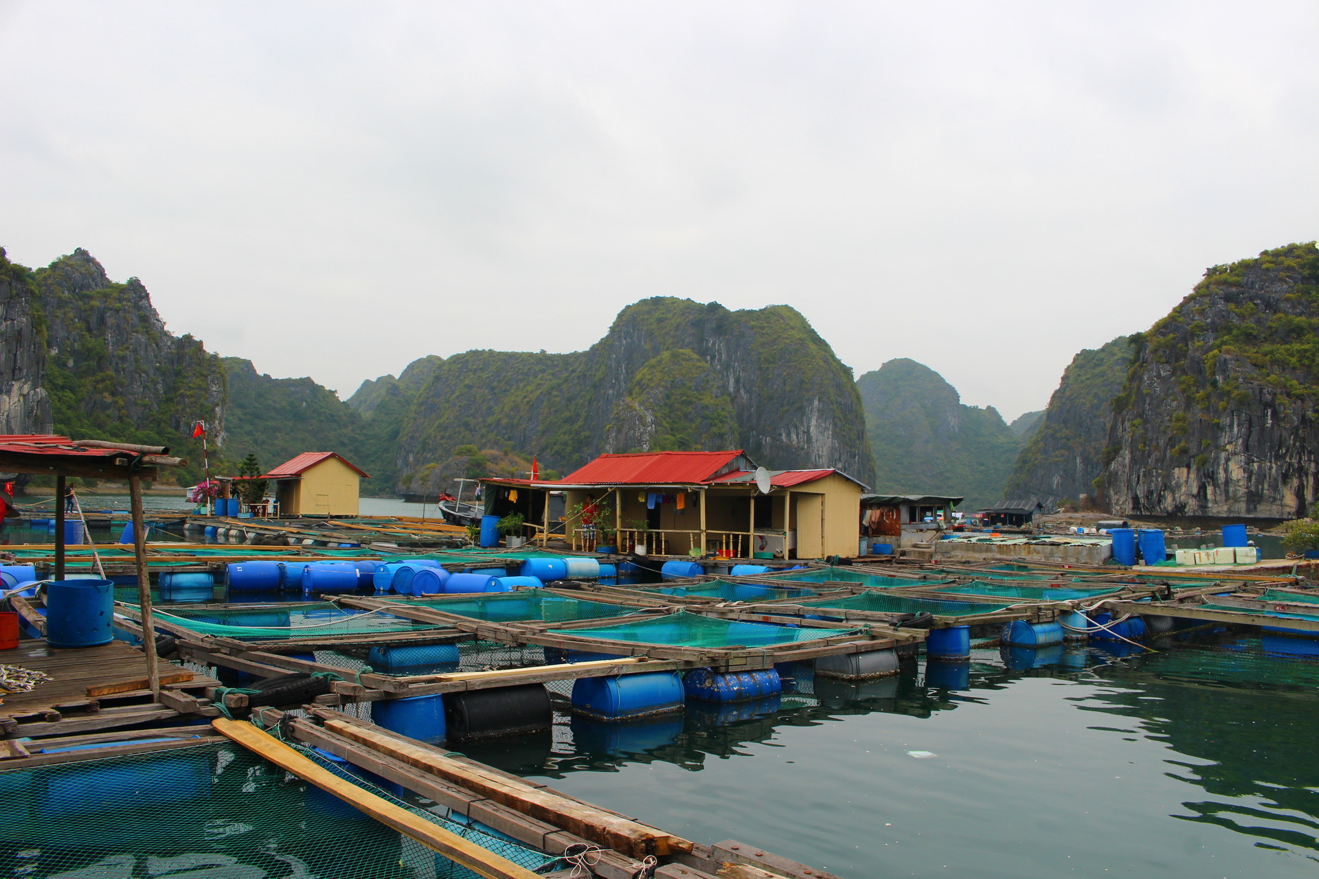 Plovoucí rybí farmy, zátoka Lan Ha Bay, Vietnam