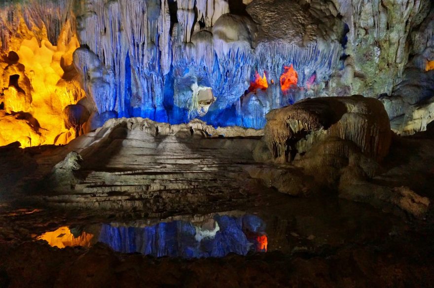 Jedna z barevných variací osvětlení Surprise Cave v zátoce Ha Long, Vietnam