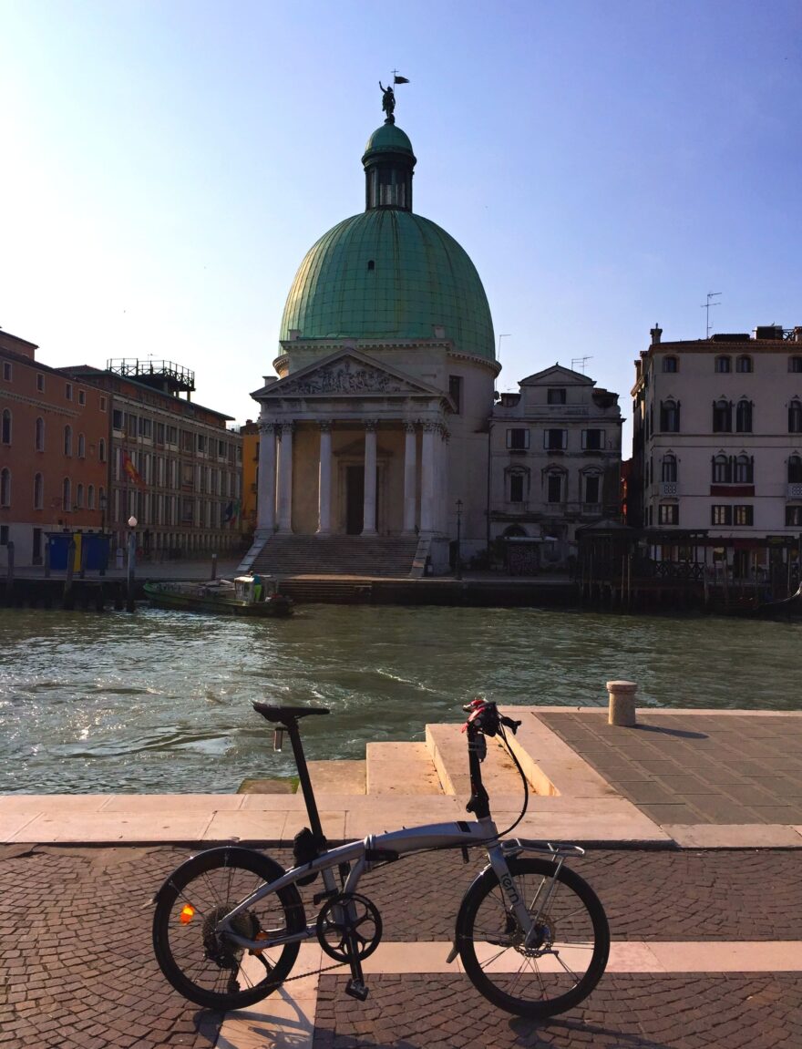 Skládačka s naloženou sportovní taškou na předním nosiči čeká na příjezd trajektu