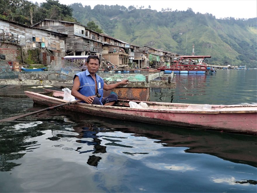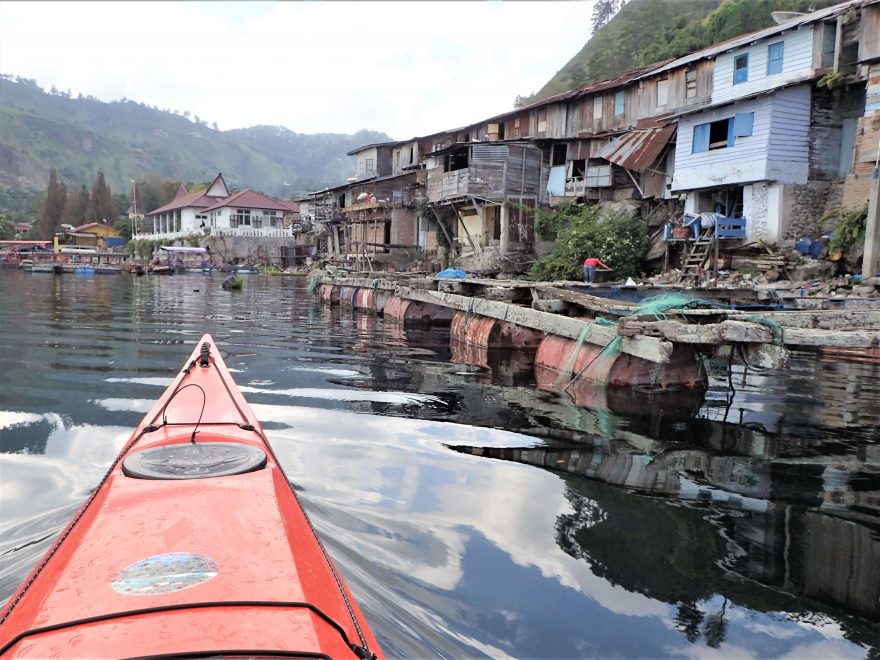 Pádlování kolem takové vesnice je trochu smutné. Krásné jezero, ale hrozný nepořádek.