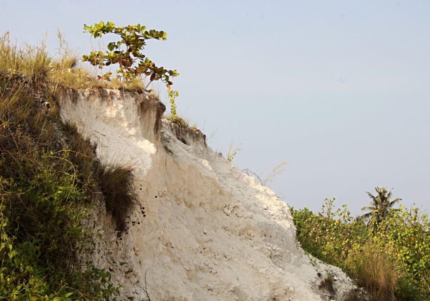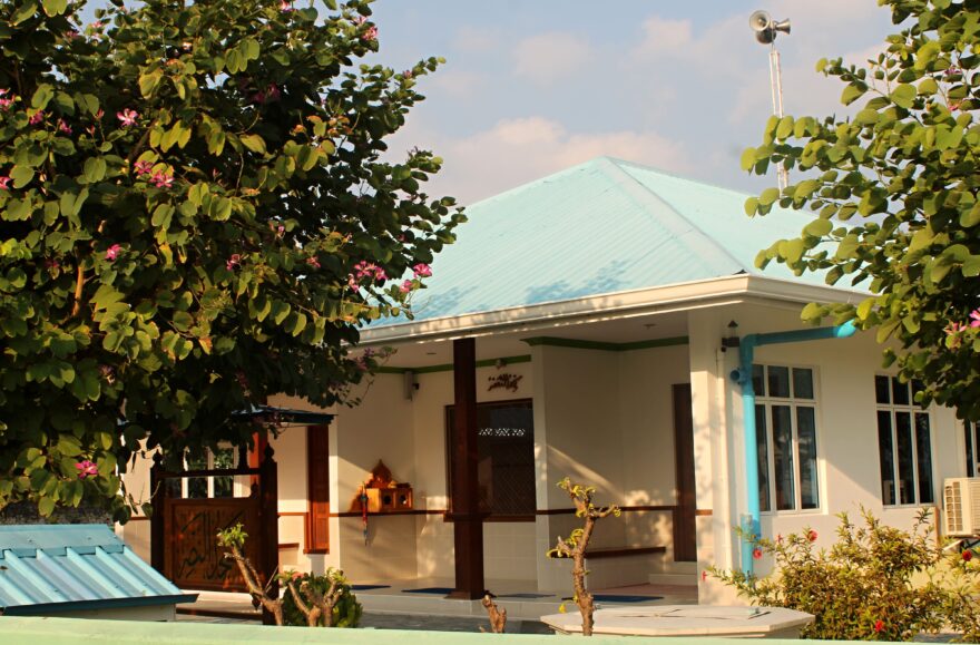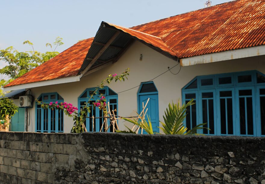 Domy mají dnes plechové střechy a zídky kolem zahrádek. Tady je zčásti betonová a zčásti ještě tradiční z korálových úlomků