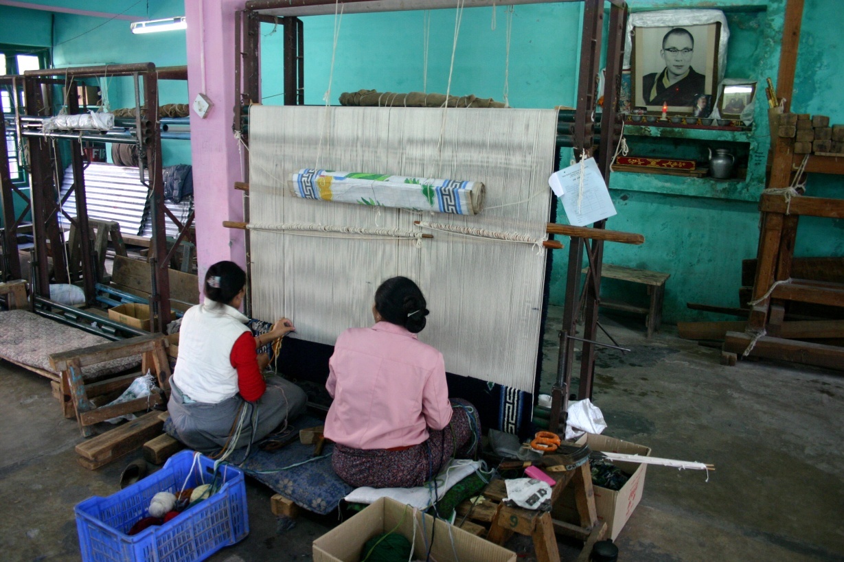 Tibetské ženy pod dohledem Dalajlámy pracují v továrně na výrobu tradičních koberců, Indie