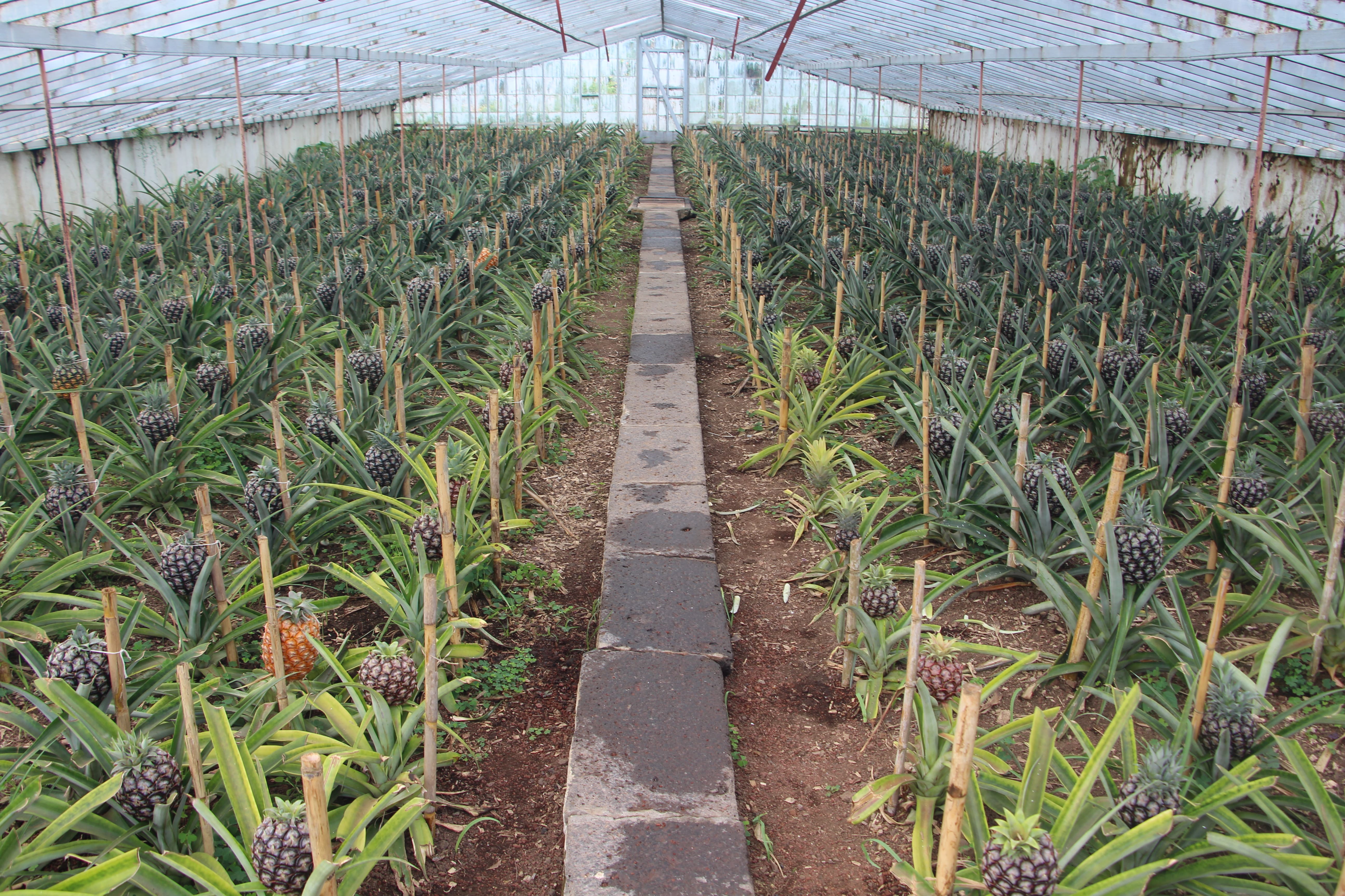 Ananasová plantáž s typickými malými, ale sladkými plody