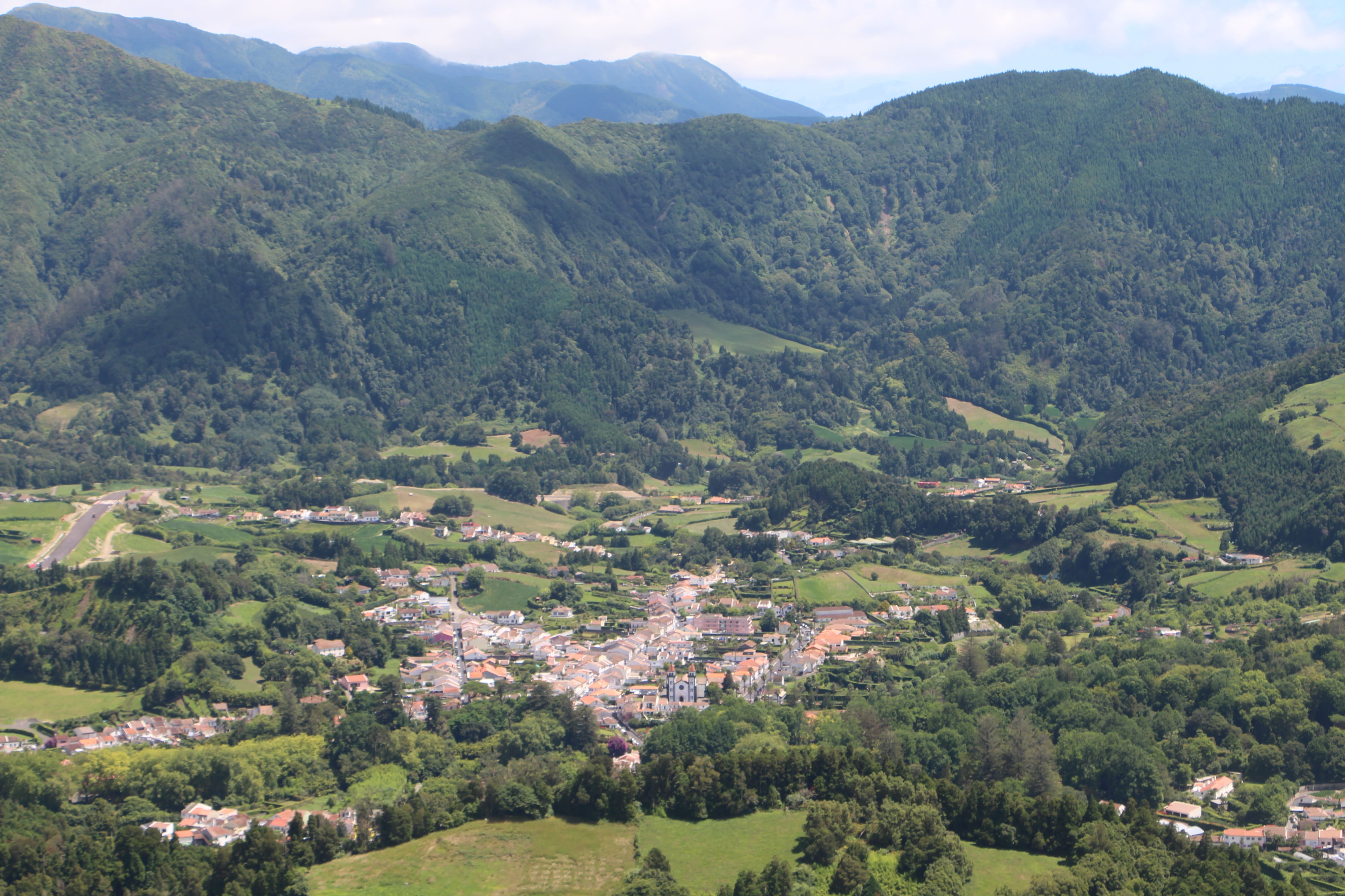Pohled do největší sopečné kaldery na ostrově s městem Furnas na samém dně