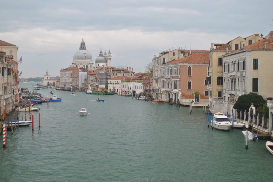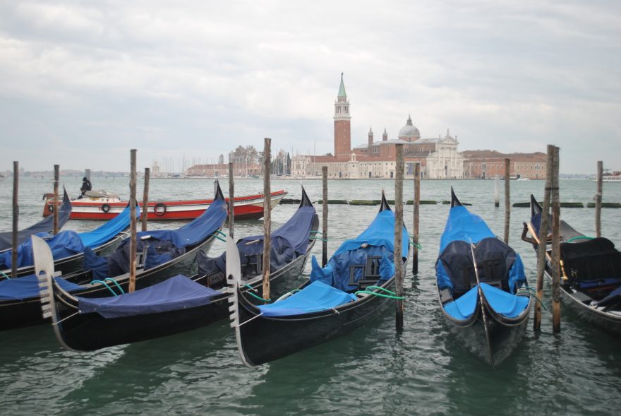 Jeden z mnoha pohledů na Basillica di Santa Maria della Salute skrytá za všudypřítomnými kůly, Itálie