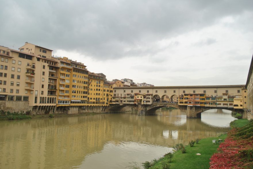 Pohled na Ponte Vecchio bez turistů od hotelu Lungarno. Florencie, Itálie