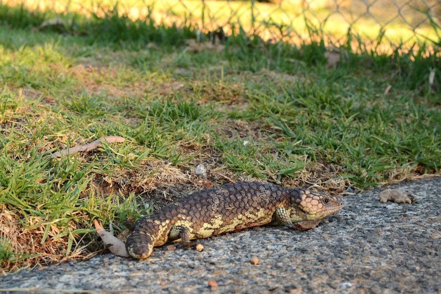 Místní „bob-tail“, jehož prehistorický vzhled nás párkrát pěkně vylekal. Je společenský a pečlivě váží své po-ma-lé kroky. Waroona, Austrálie