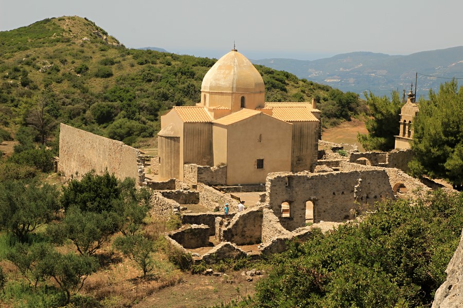 Ruiny byzantského kláštera na Mount Skopos s vyhlídkou na celý poloostrov Vasilikos
