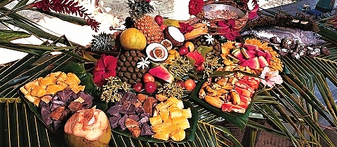 Robinsonův piknik na motu: čerstvé ovoce, právě ulovené ryby a kokosy