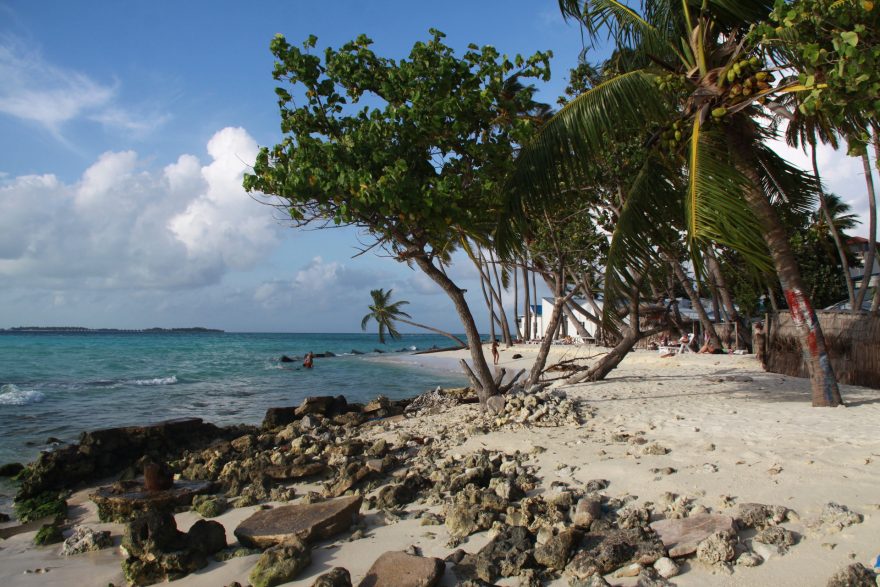 Turistická pláž na Maafushi, Maledivy
