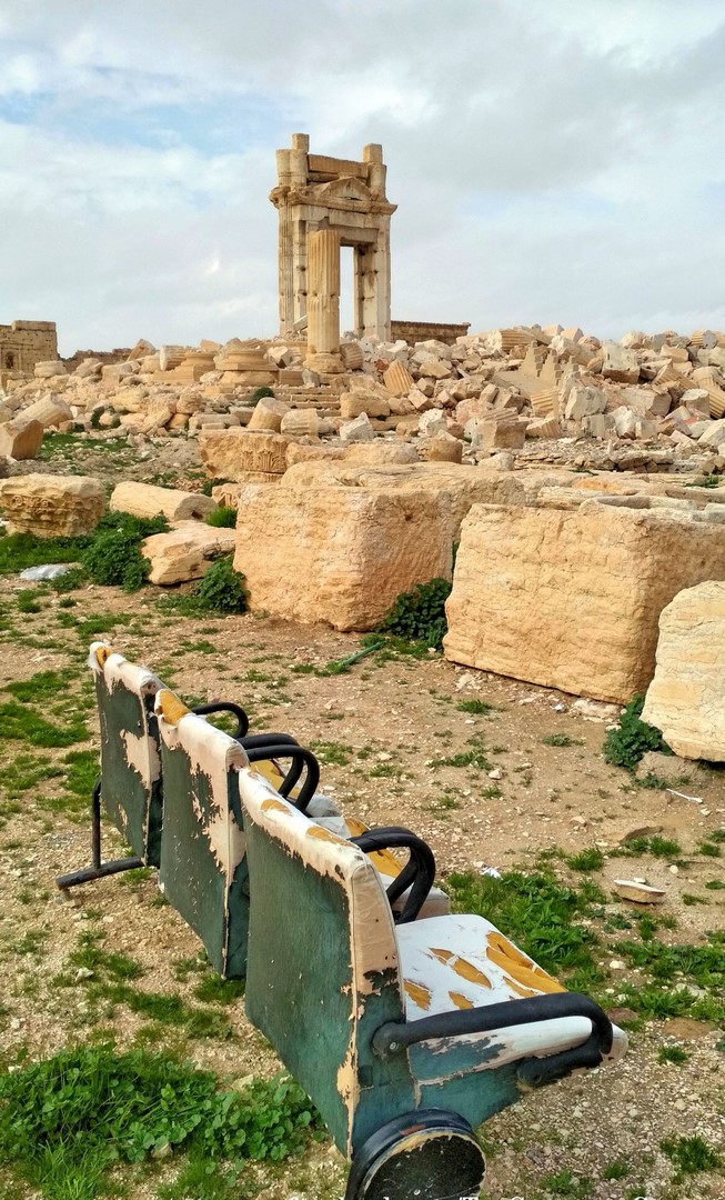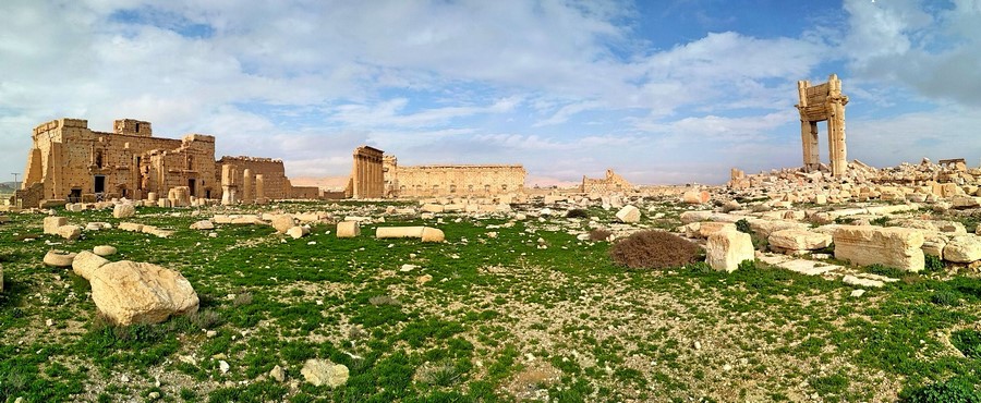 Zničené antické město Palmýra tzv. Islámským státem. Zde stával Belův chrám – zbyly pouhé trosky a jeden oblouk vstupní brány