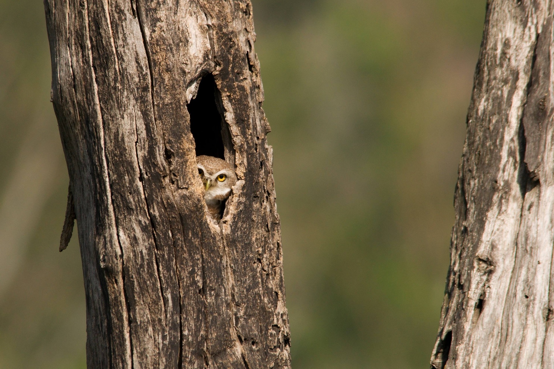 V indických národních parcích žije také spousta ptáků. Zde ze své dutiny vykukuje sýček brahminský