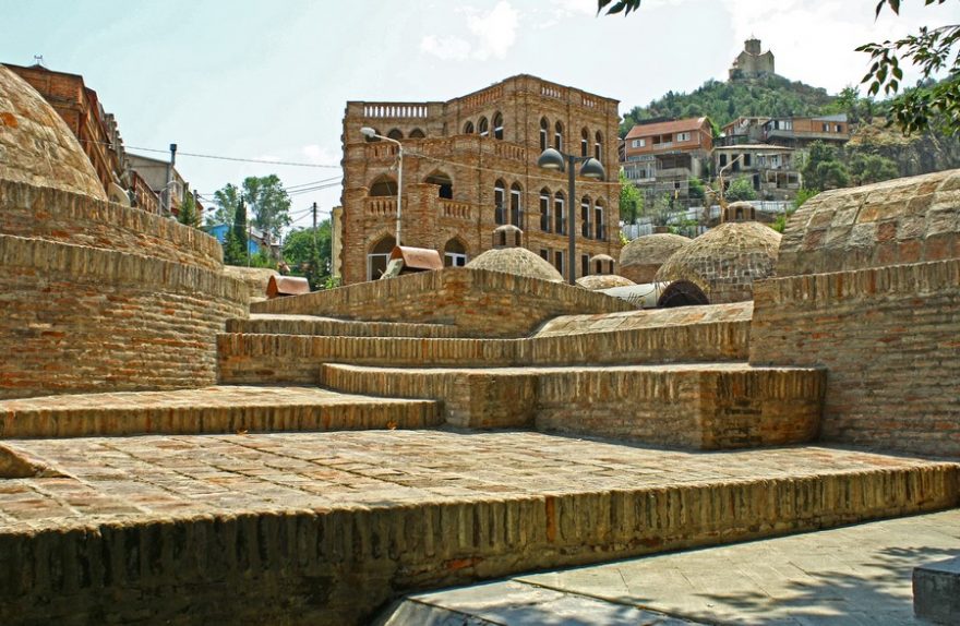 Koryto od vodopádu Dzveli, říčka obtékající syrné lázně Orbeliani, s výrazným mozaikovým průčelím